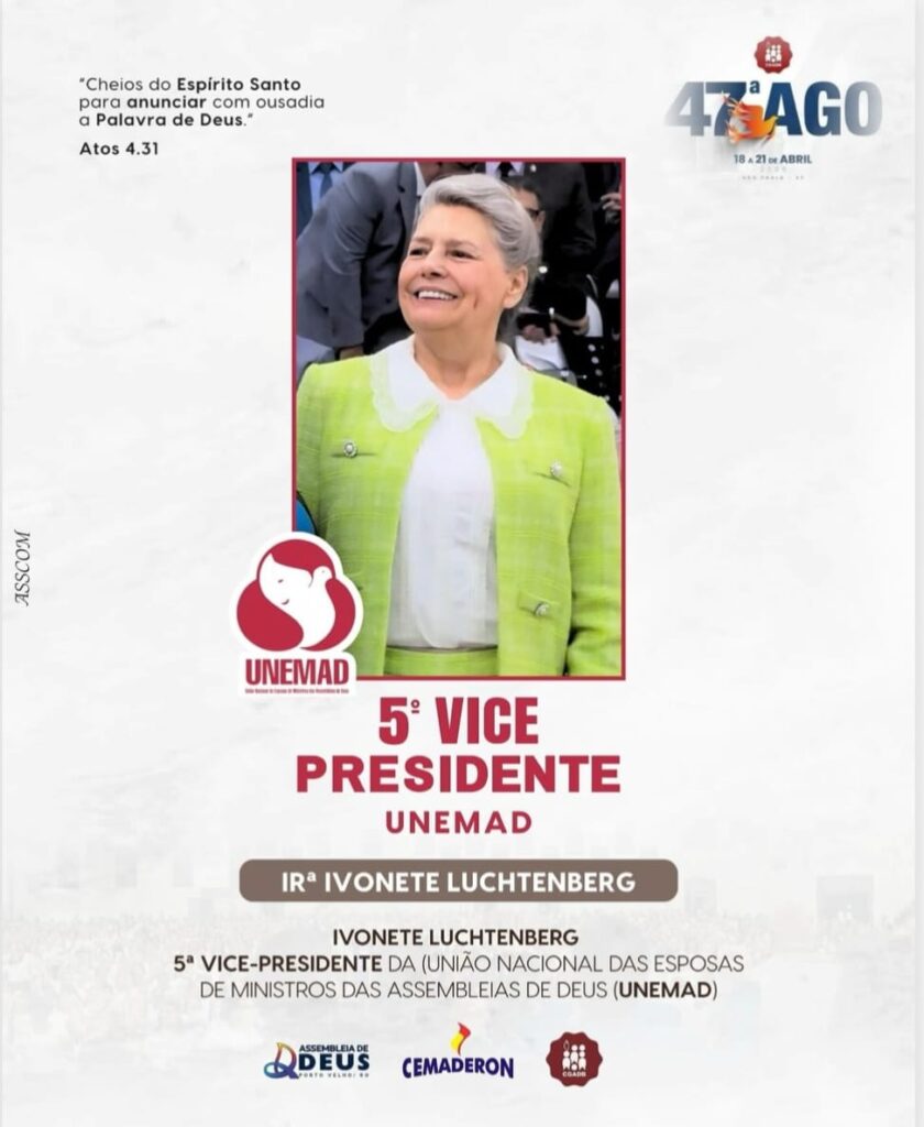 Irmã Ivonete Luchtenberg, a UFADER – União Feminina das Assembleias de Deus do Estado de Rondônia te parabeniza e rogamos a Deus que Te capacite para esse novo chamado.
